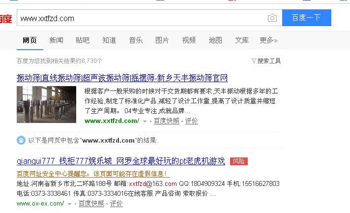 第二條信息,下面的地址,郵箱啊等等資料都是我們新鄉(xiāng)市天豐振動(dòng)機(jī)械公司的,但是打開內(nèi)容,卻是一個(gè)很不的網(wǎng)站,我查看了一下源代碼,沒(méi)有我們公司的,這是什么情況呢,然后我又看百度快照信息,結(jié)果如下: